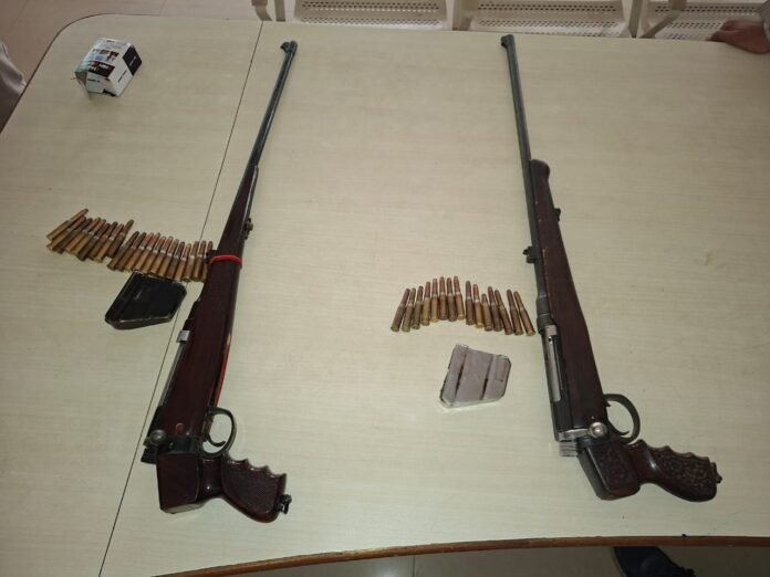 लाइसेंसी हथियारों का अवैध रूप से परिवहन करने वाले दो व्यक्ति को पुलिस ने पकड़ा, दो रायफल, 36 राउंड व डिफेंडर कार की जप्त