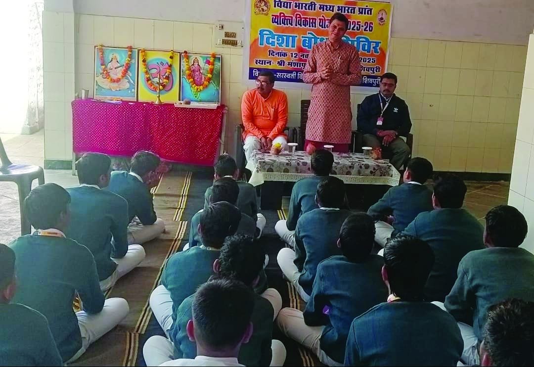 शिवपुरी। विद्या भारती मध्य भारत प्रांत की योजना अनुसार सरस्वती विद्यापीठ आवासीय विद्यालय में कक्षा 9 के भैयाओं के लिए त्रिदिवसीय दिशा बोध शिविर का शुभारंभ सिद्धदेव स्थान श्री मंशापूर्ण मंदिर परिसर में हुआ। शुभारंभ सत्र में मुख्य अतिथि महंत लक्ष्मीकांत शर्मा, विद्यालय के प्रबंधक पवन शर्मा एवं प्राचार्य लोकेन्द्र सिंह मेवाड़ा ने दीप प्रज्ज्वलन कर माँ सरस्वती की वंदना की।